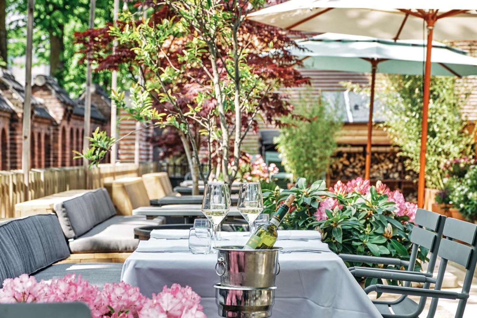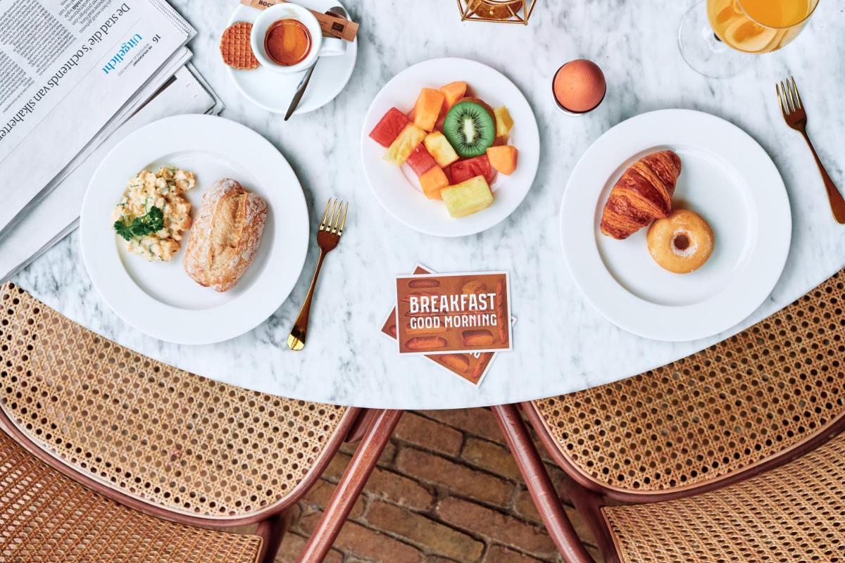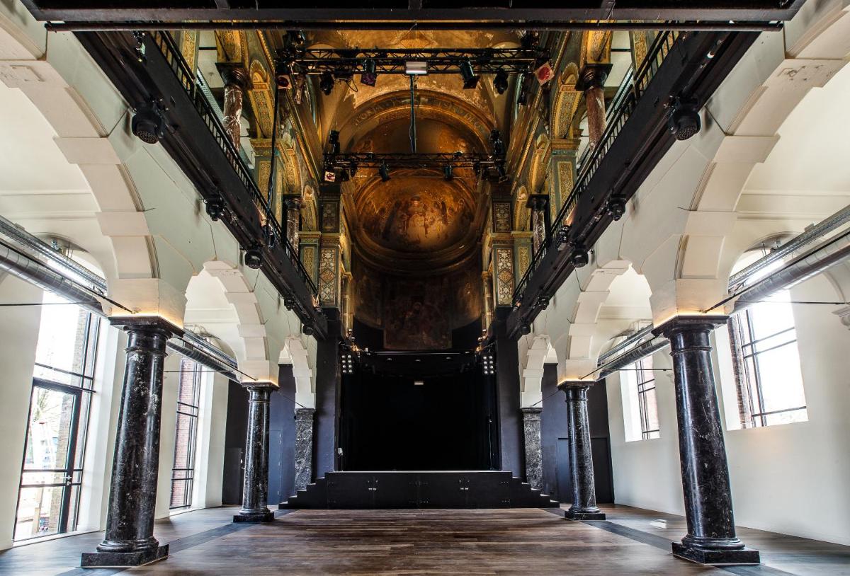 The gallery captures the hotel’s restored chapel with stained-glass windows, minimalist yet warm guest rooms, and the greenery of Oosterpark. Images highlight PARK Café’s modern dining space, as well as event venues like The Patio and The Salon.