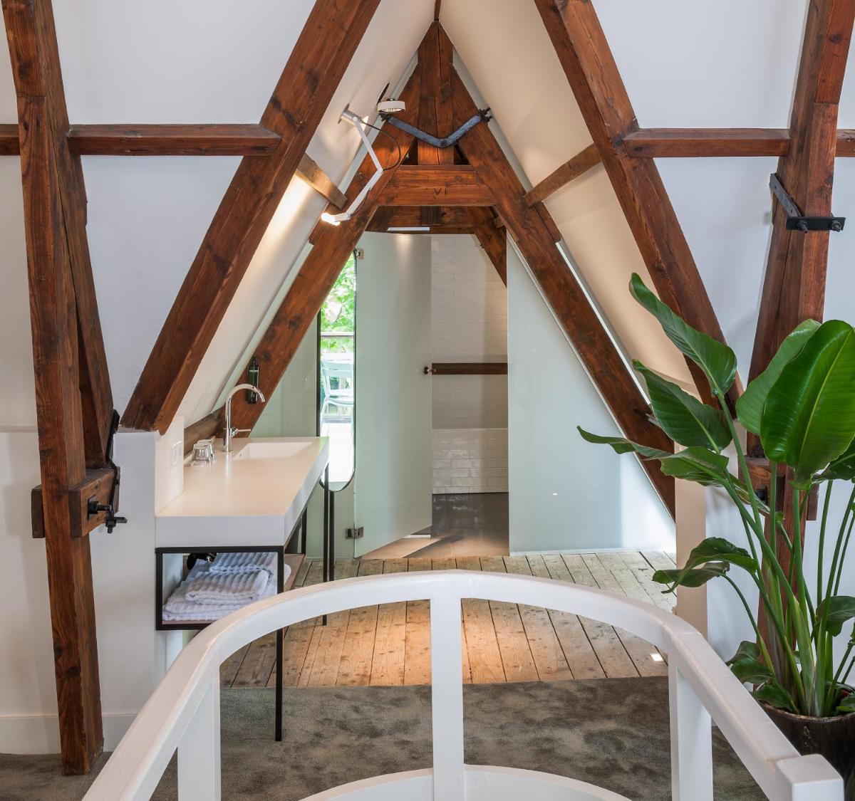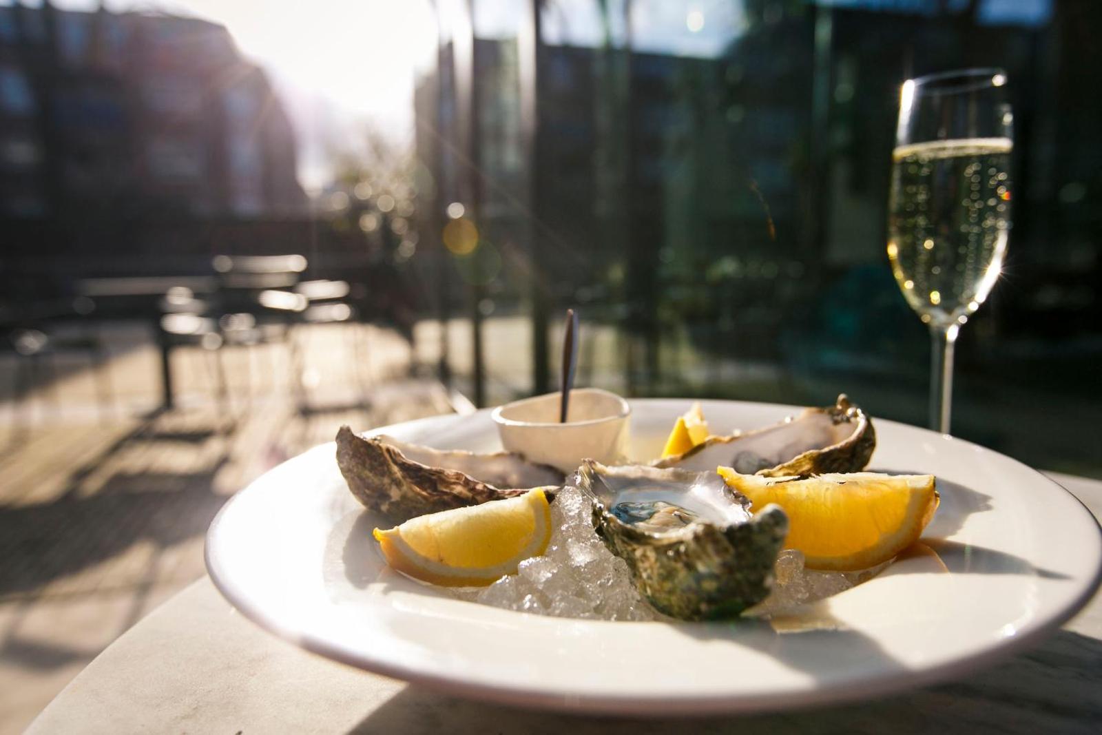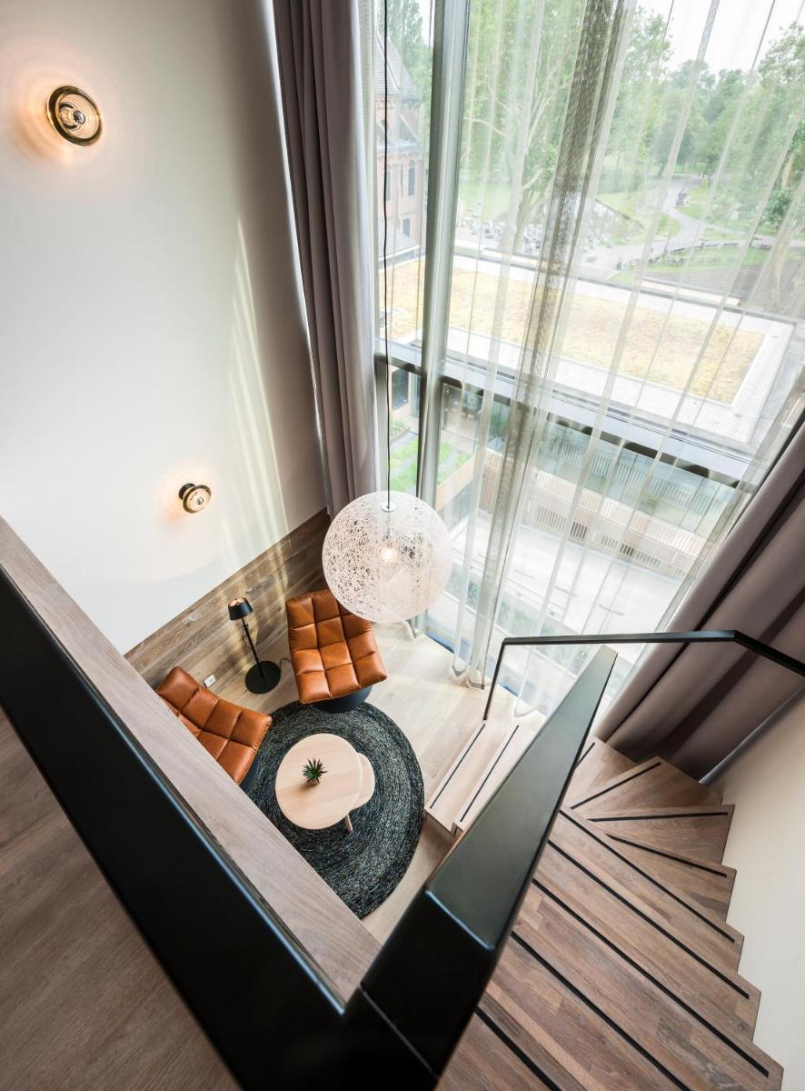The gallery captures the hotel’s restored chapel with stained-glass windows, minimalist yet warm guest rooms, and the greenery of Oosterpark. Images highlight PARK Café’s modern dining space, as well as event venues like The Patio and The Salon.